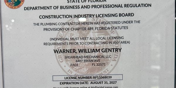 Spearhead Mechanical is a fully licensed and registered plumbing contractor in the State of Florida, meeting all state and local requirements for residential and commercial plumbing work.